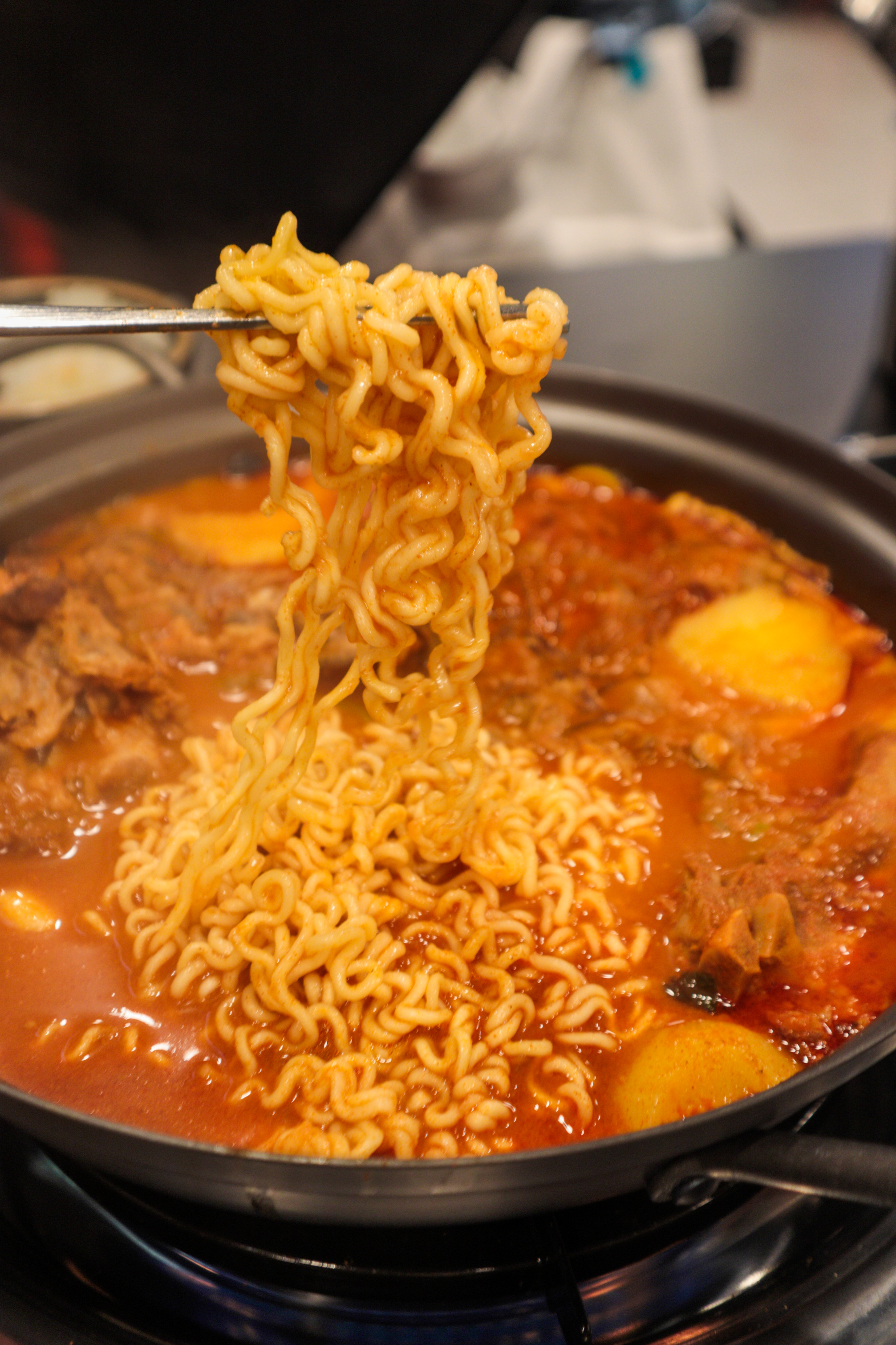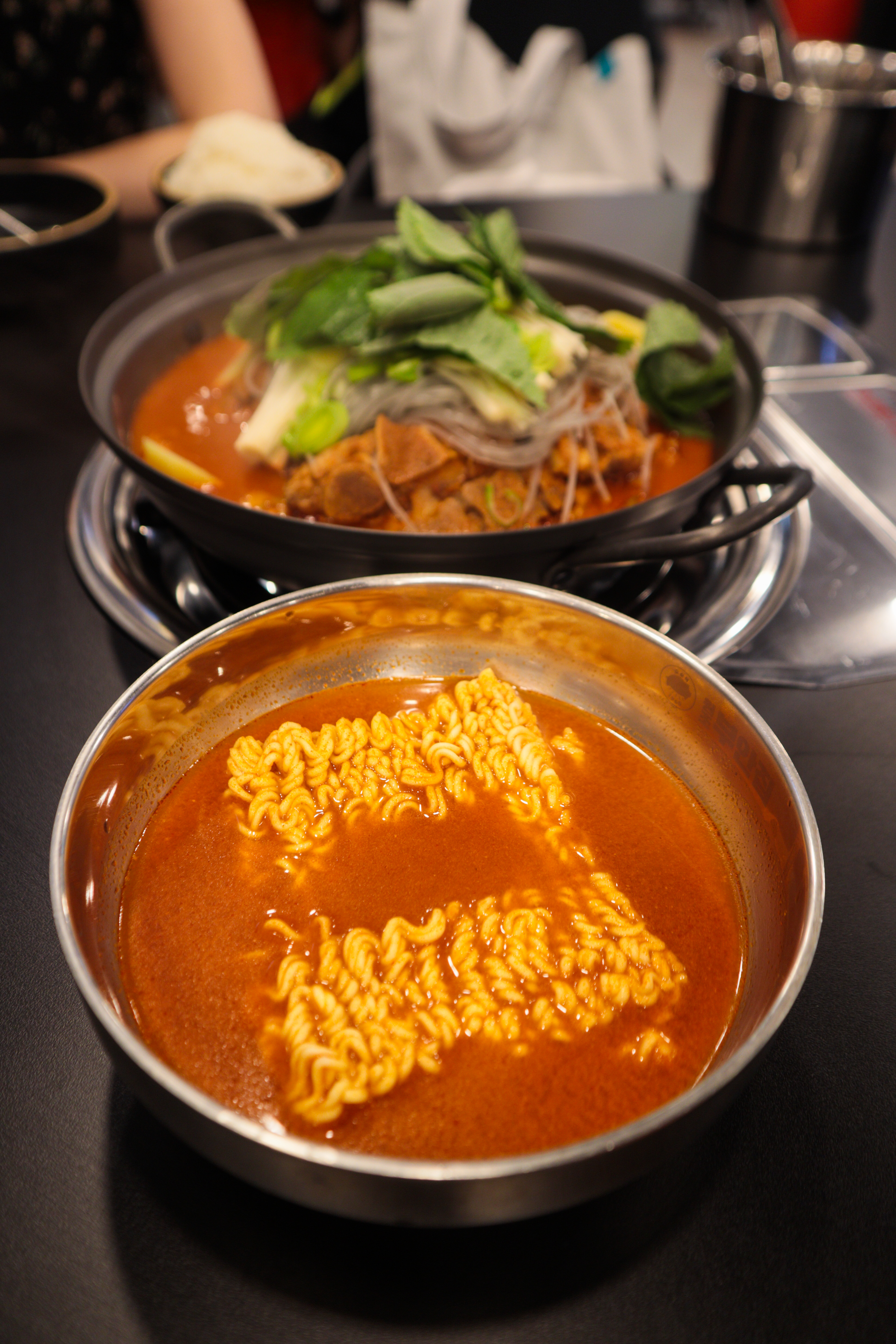 The stew packed a satisfying spicy kick, though we did find the absence of perilla seeds a little disappointing. Still, the portion was filling enough that we could do without adding ramen, thanks to the generous amount of glass noodles already in the pot.