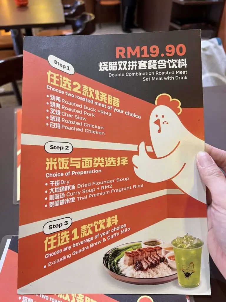 The Double Combination Roasted Set Meal (RM19.90) offers solid value for money. It comes with your choice of beverage, with optional upgrades to curry or dried flounder soup.