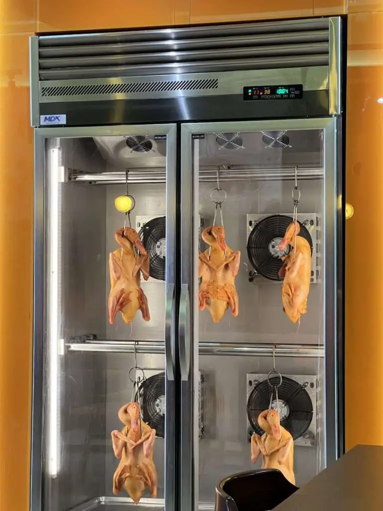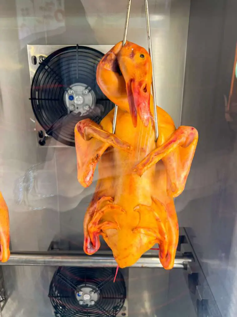 The roast duck is dry-aged for 12 hours before being roasted over charcoal, resulting in succulent meat with a nicely tightened skin.
