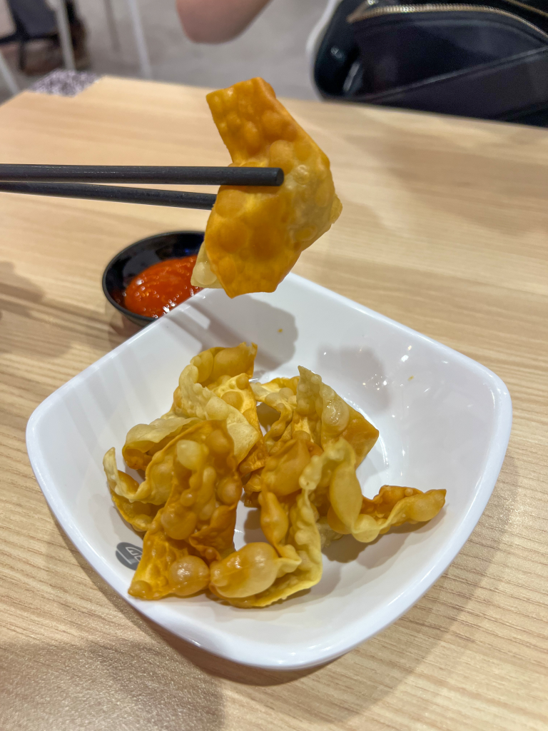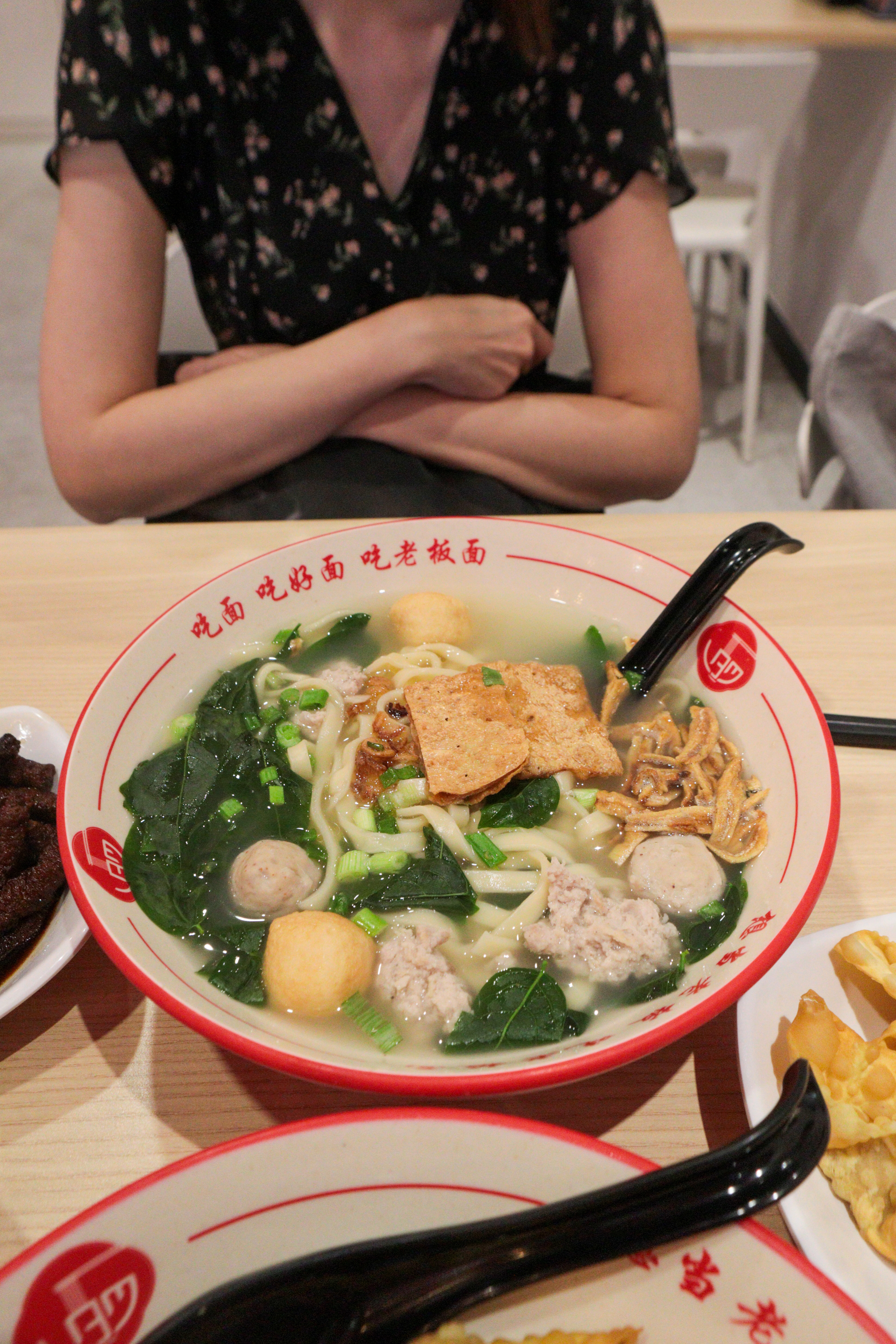 The noodles were topped with crispy beancurd skin and fried pork wontons, and served alongside a bowl of soup.