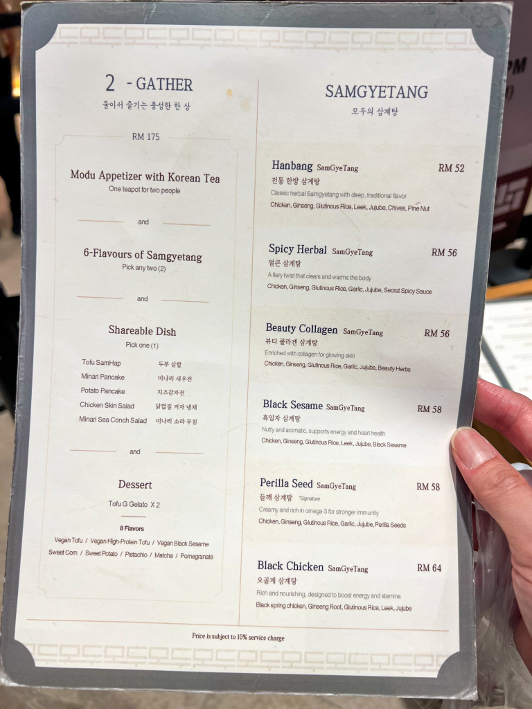 The meal is rounded out with sides like kalguksu (hand-cut noodles), crispy potato pancakes, and a tofu-based gelato that’s light and refreshing after a hearty soup. MODU also offers a 2-GATHER set meal (RM175), which includes two samgyetang, tea, appetisers, and dessert. That said, we found a single bowl to be quite generous and easily shareable between two.