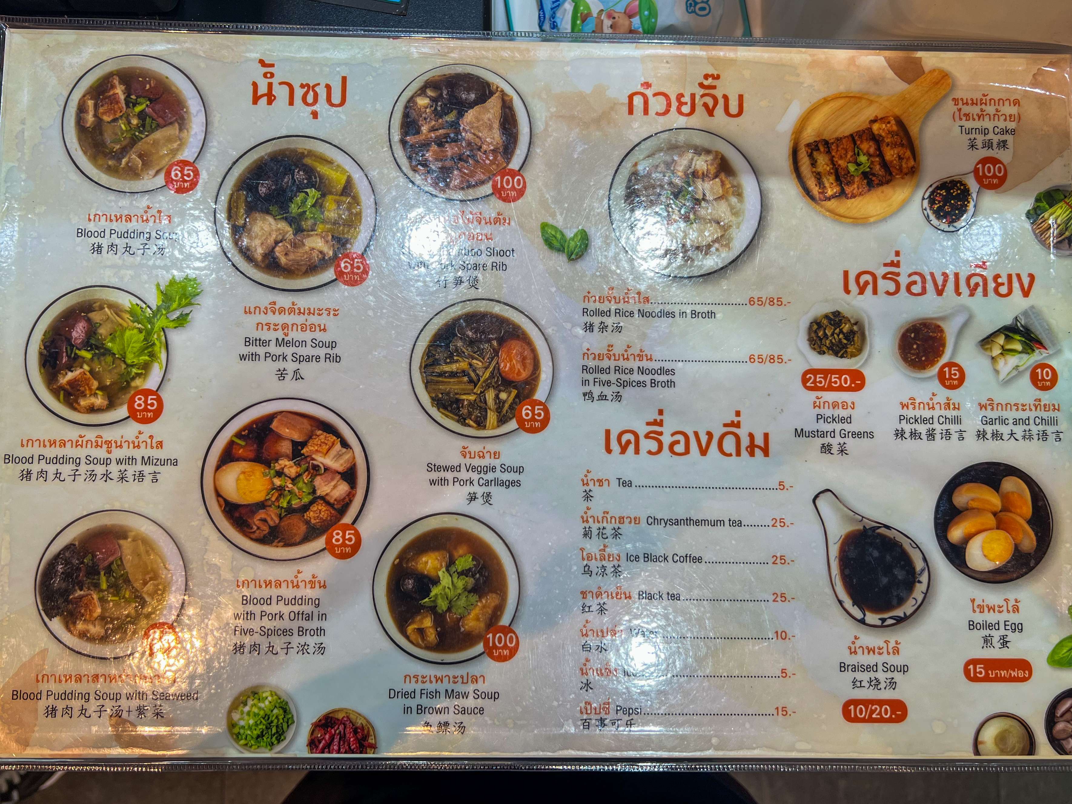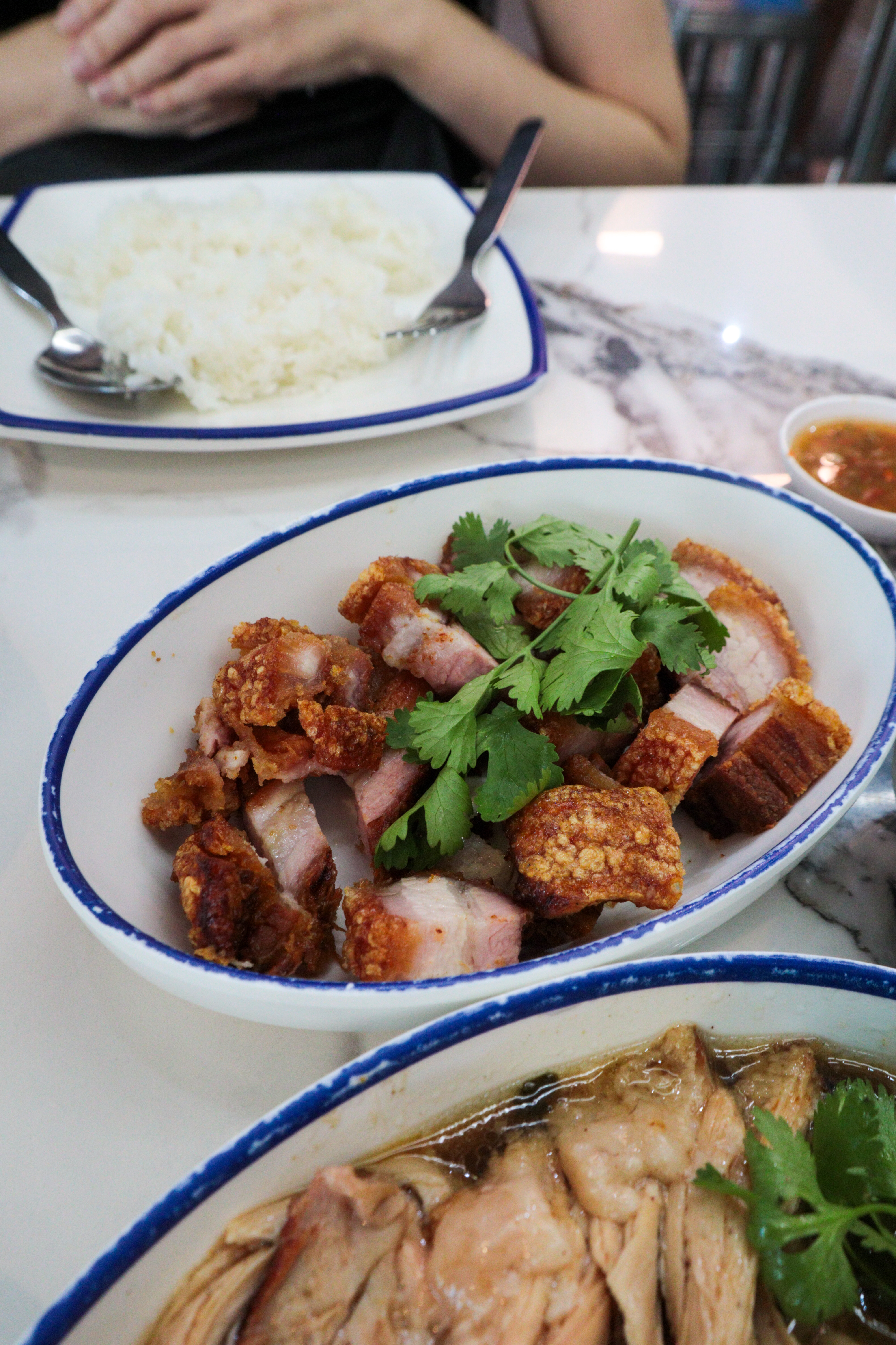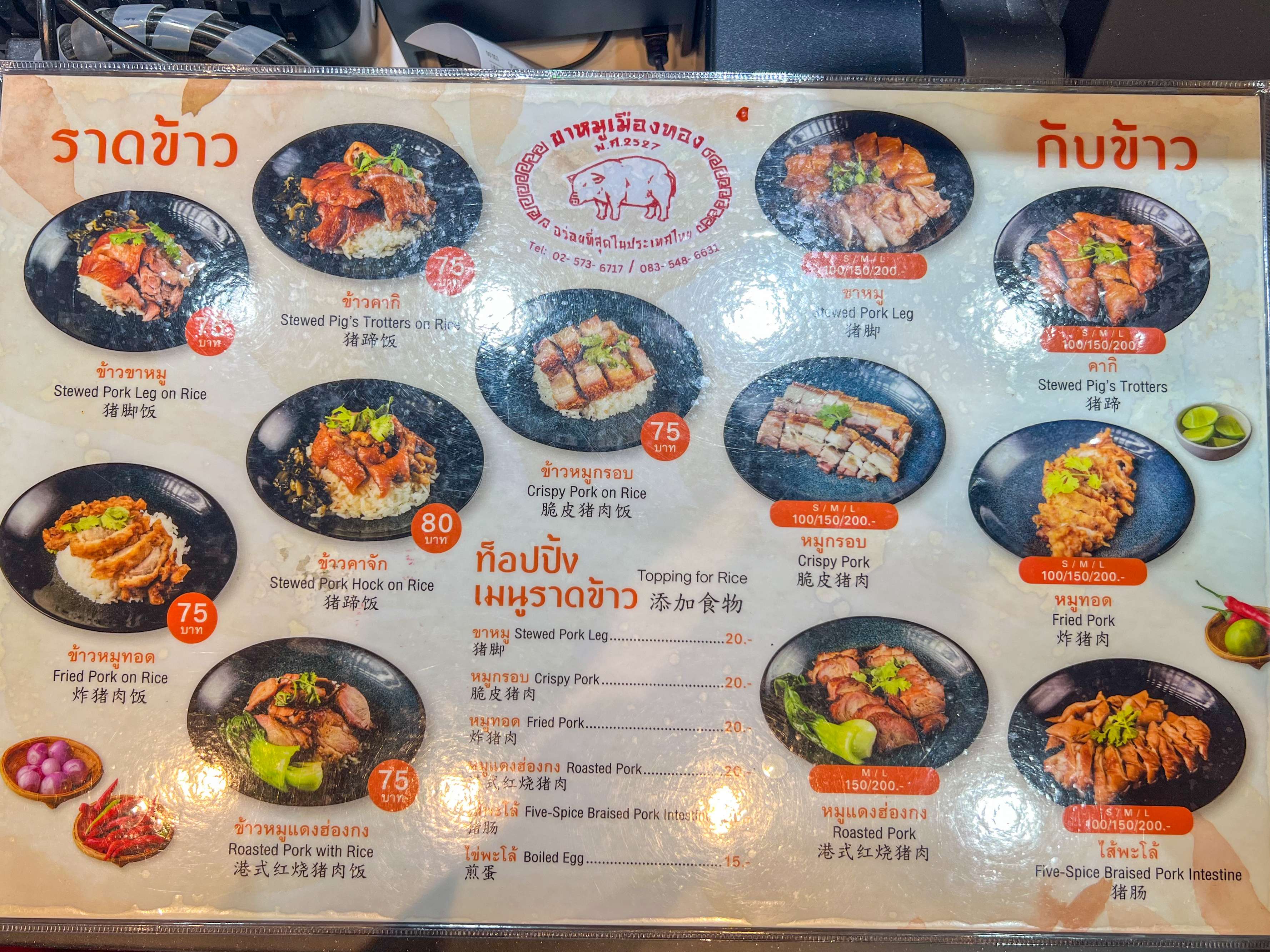 Plates of stewed pork leg on rice start from THB75 (around USD2.30). In addition to khao ka moo, they also serve siew yoke, char siew, and fried pork.