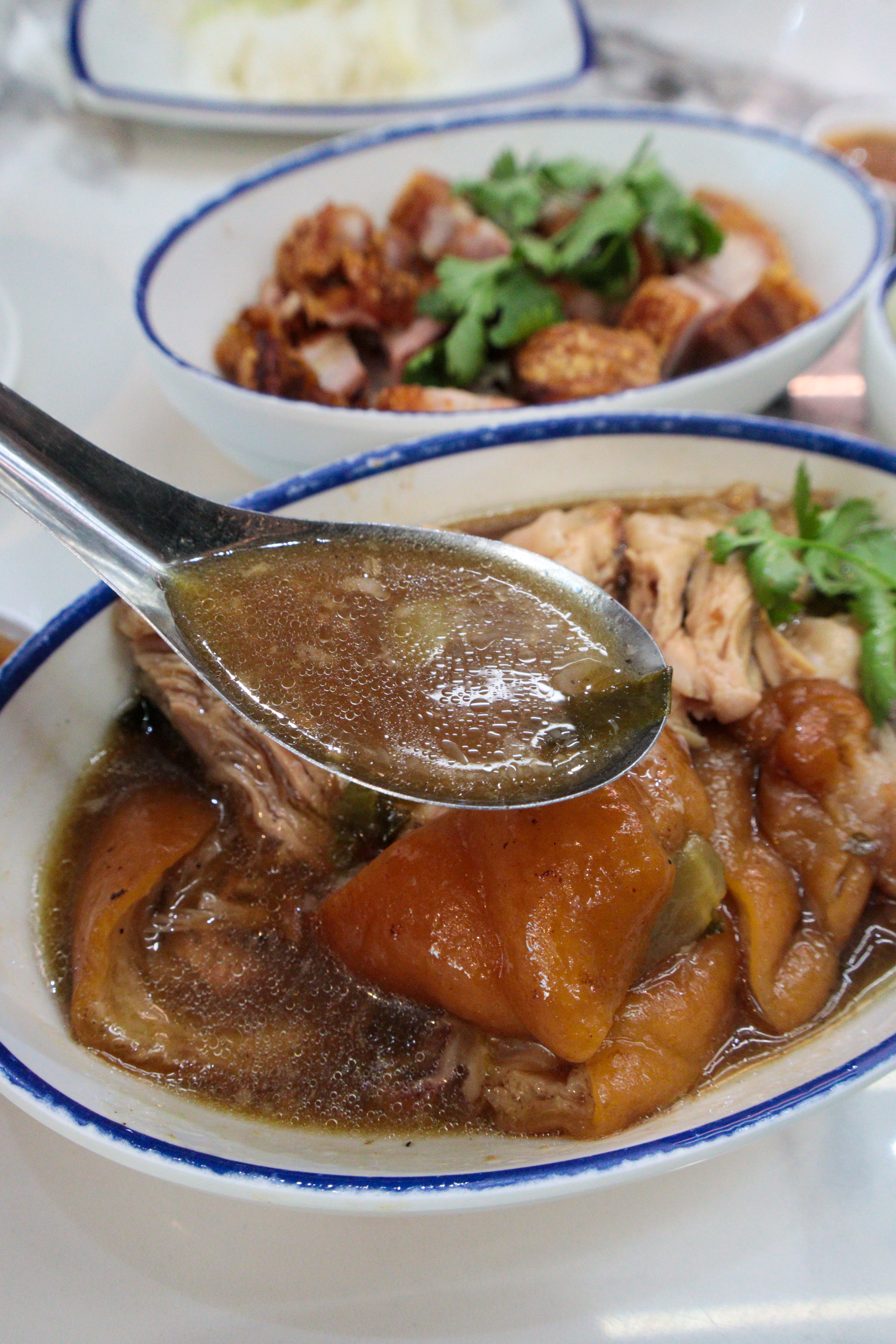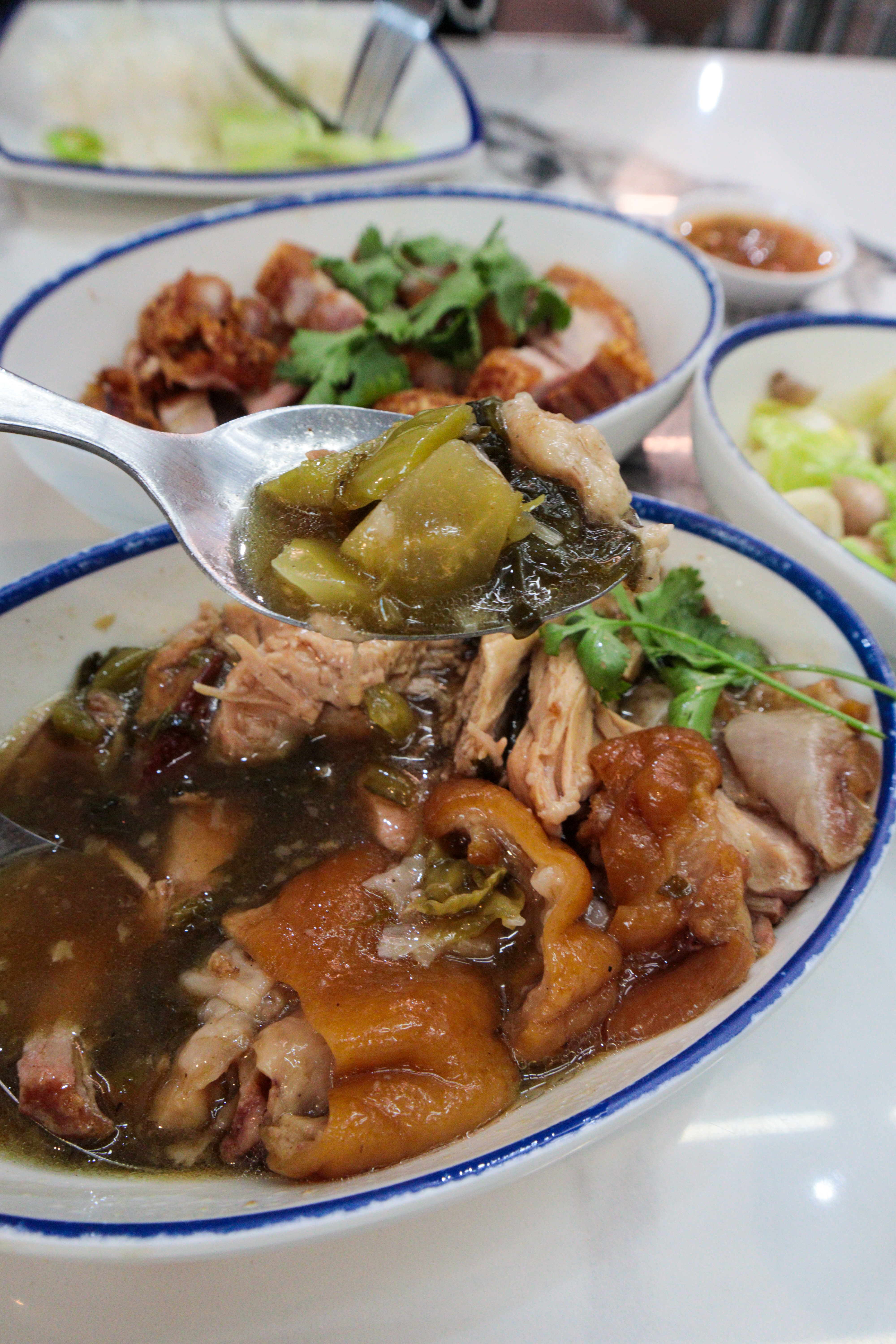 The two of us ordered the Stewed Pork Leg (THB100) to share, along with Crispy Pork (THB100). We also added Stir-Fried Cabbage and Bittergourd Soup with Ribs (THB65).