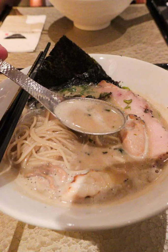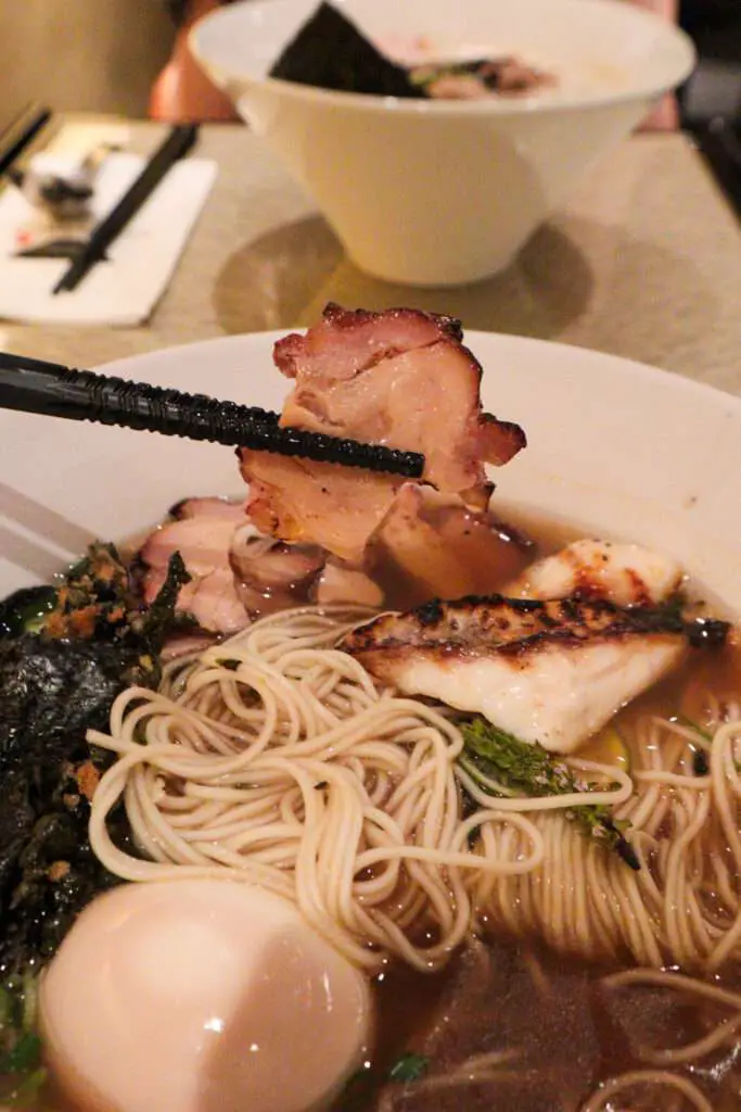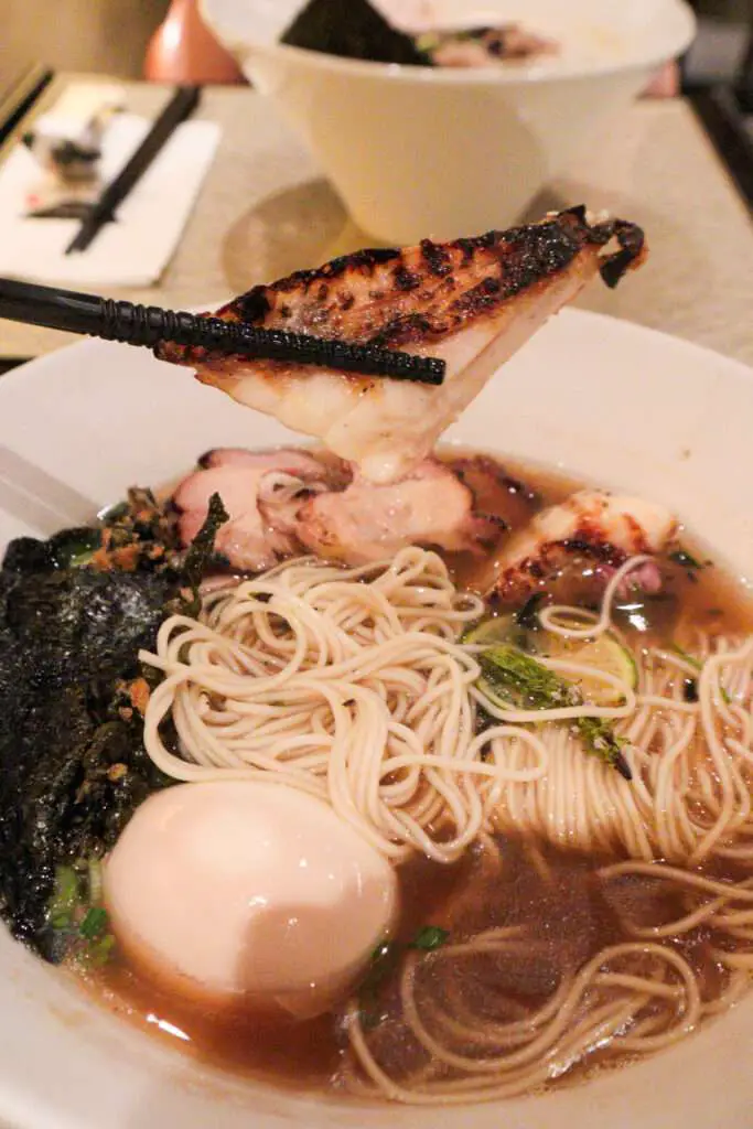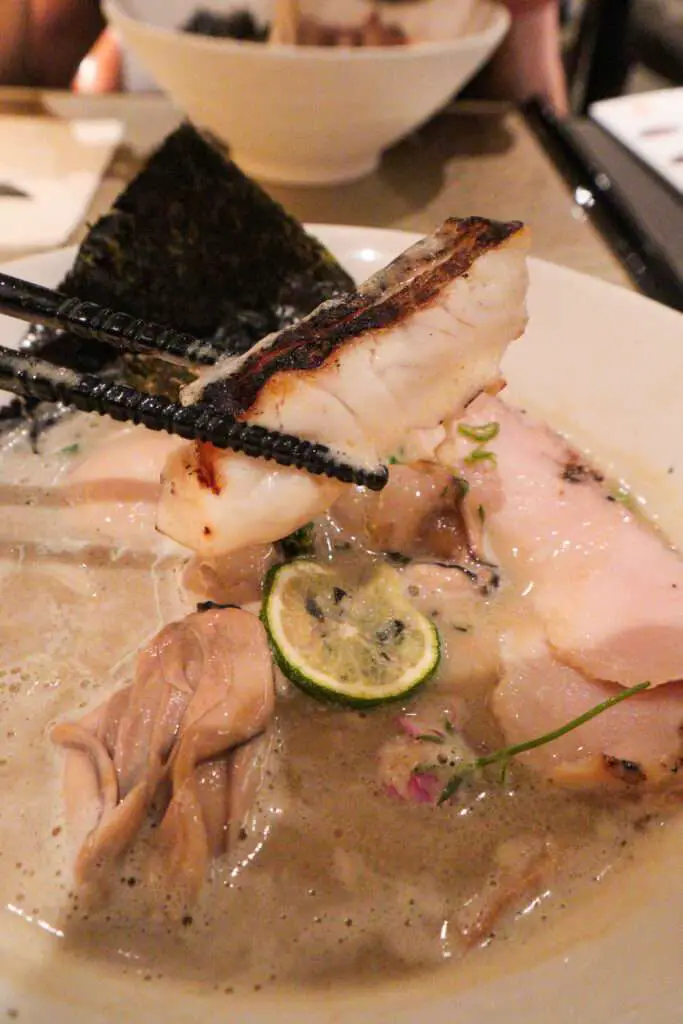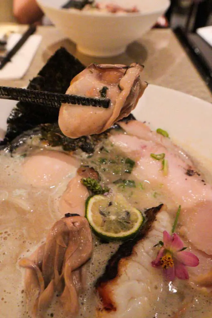 We found the broth well balanced—creamy and savoury without being overly fishy, with a gentle touch of acidity from the lime and edible flowers. It reminded us of the excellent oyster ramen we had in Tokyo (check out our post here).