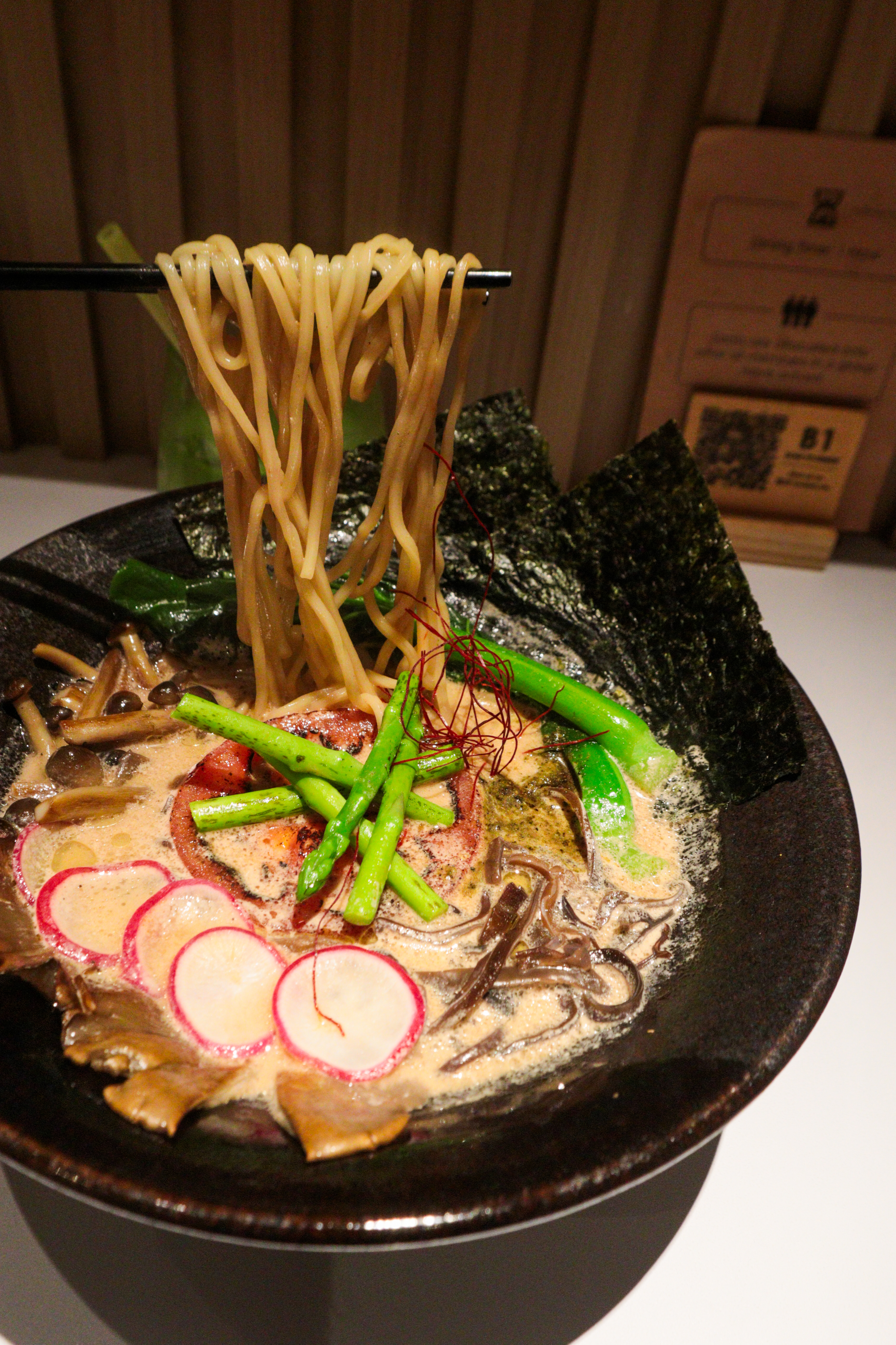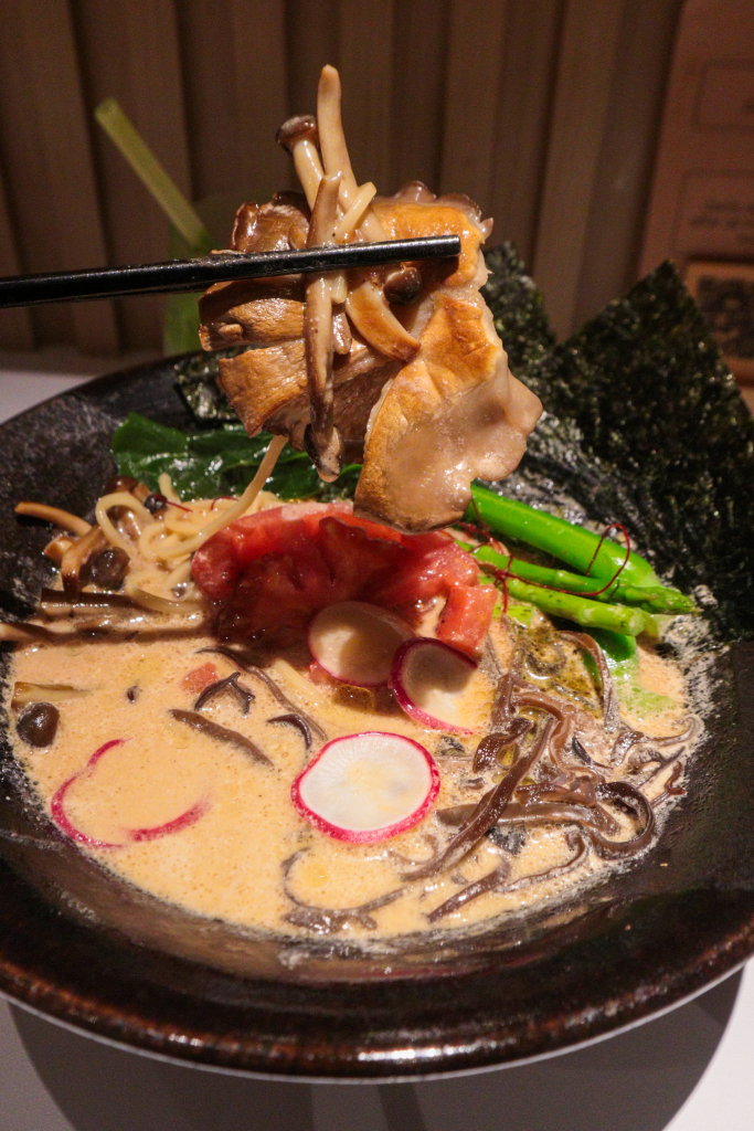 We appreciate that Towzen uses just the right amount of truffle to avoid any jelak-ness. There’s no mock meat here—just a slice of tomato standing in for chashu, along with plenty of torched mushrooms that add a satisfying bite. The noodles are firm, chewy, and carry the flavours well.